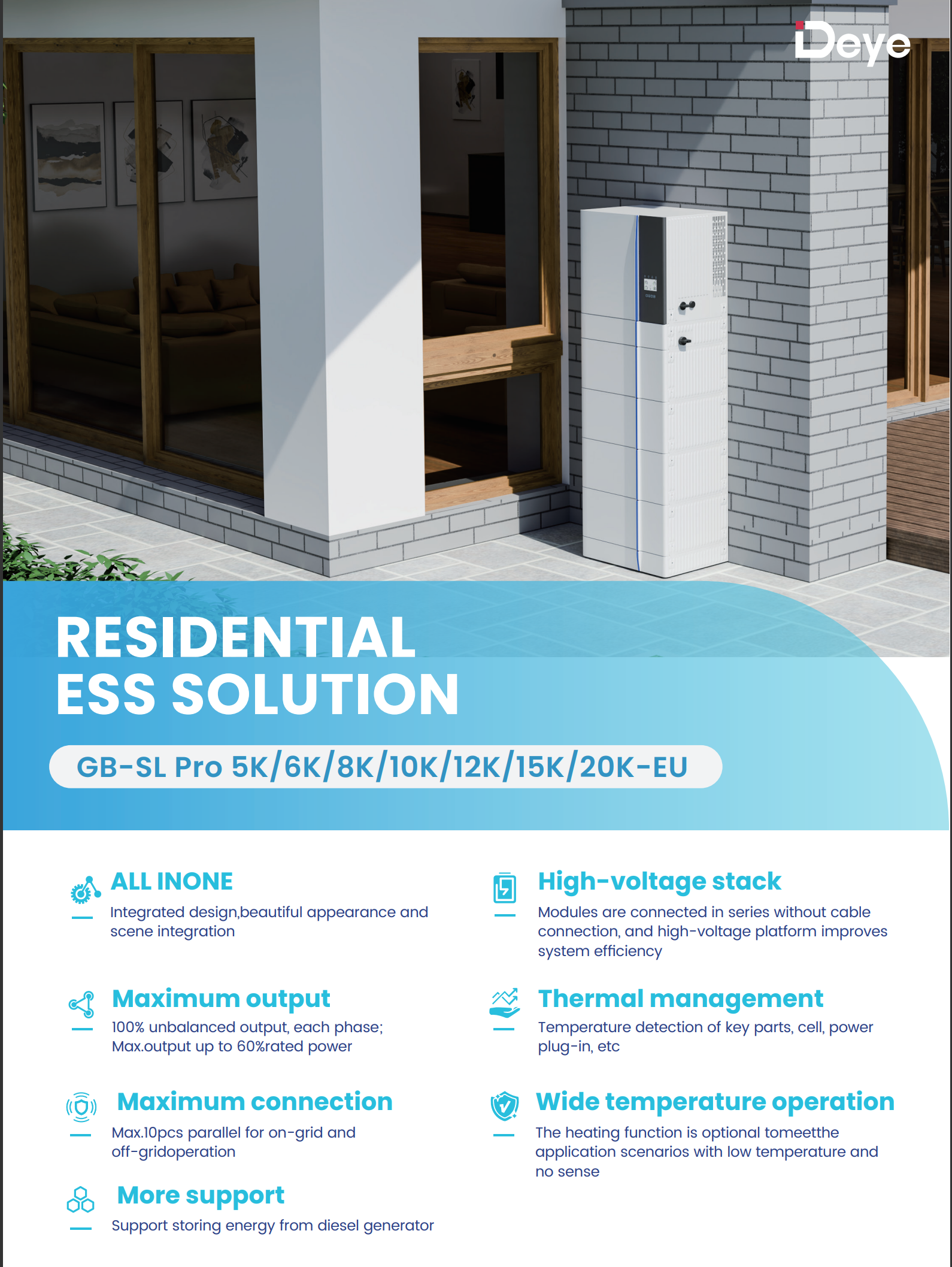 Deye residential energy storage solution is designed to provide energy independence, efficiency, and intelligent control. This integrated system combines a hybrid inverter with a high-performance LFP battery in a sleek, compact unit, empowering homeowners to harness solar power, reduce electricity costs, and ensure backup power during outages.